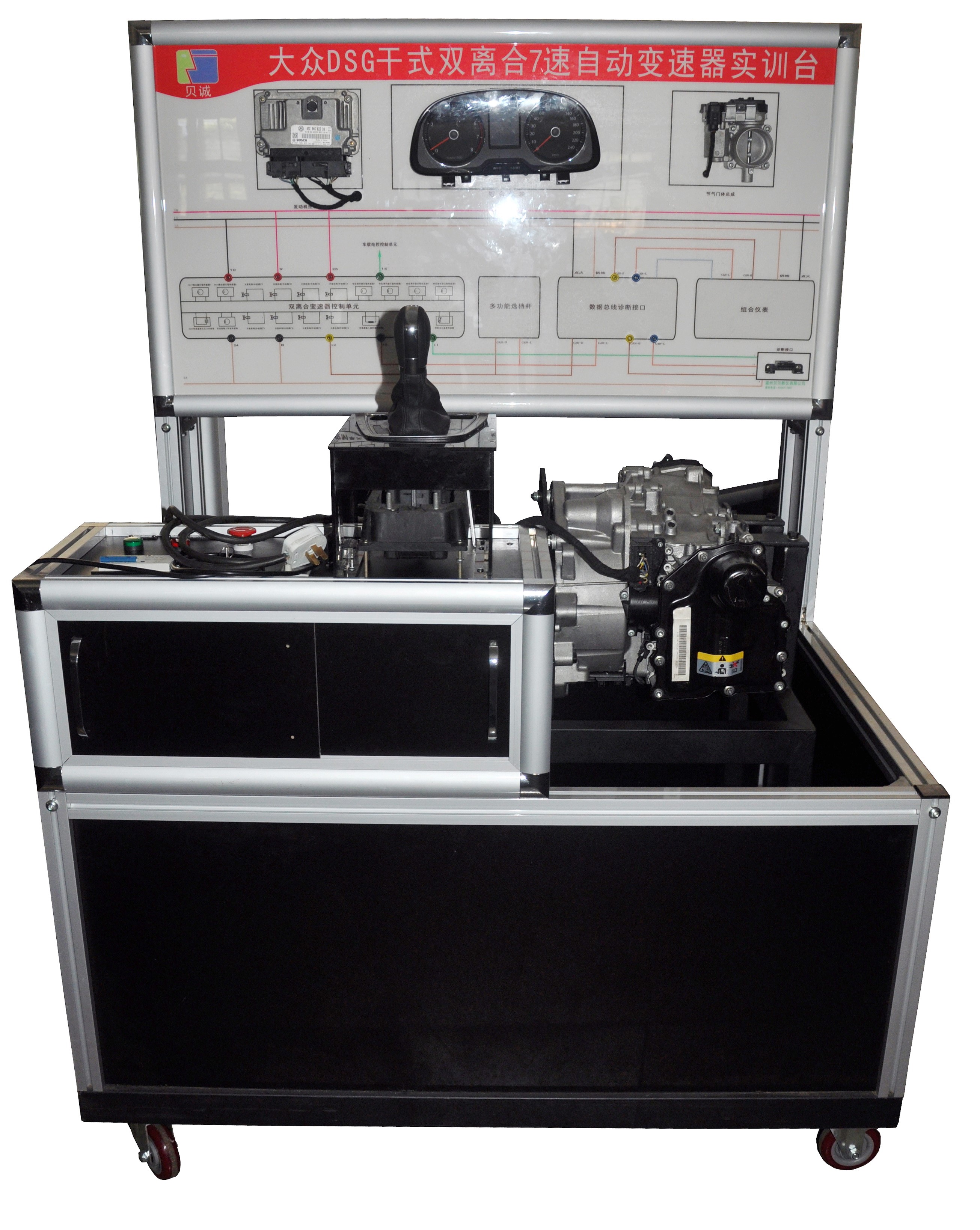 2、通過原廠的換擋裝置對變速器實訓臺進行操作;通過調(diào)速電機模擬發(fā)動機轉(zhuǎn)速;通過可調(diào)節(jié)電位計模擬車速;通過鉗盤制動系統(tǒng)對變速器加載