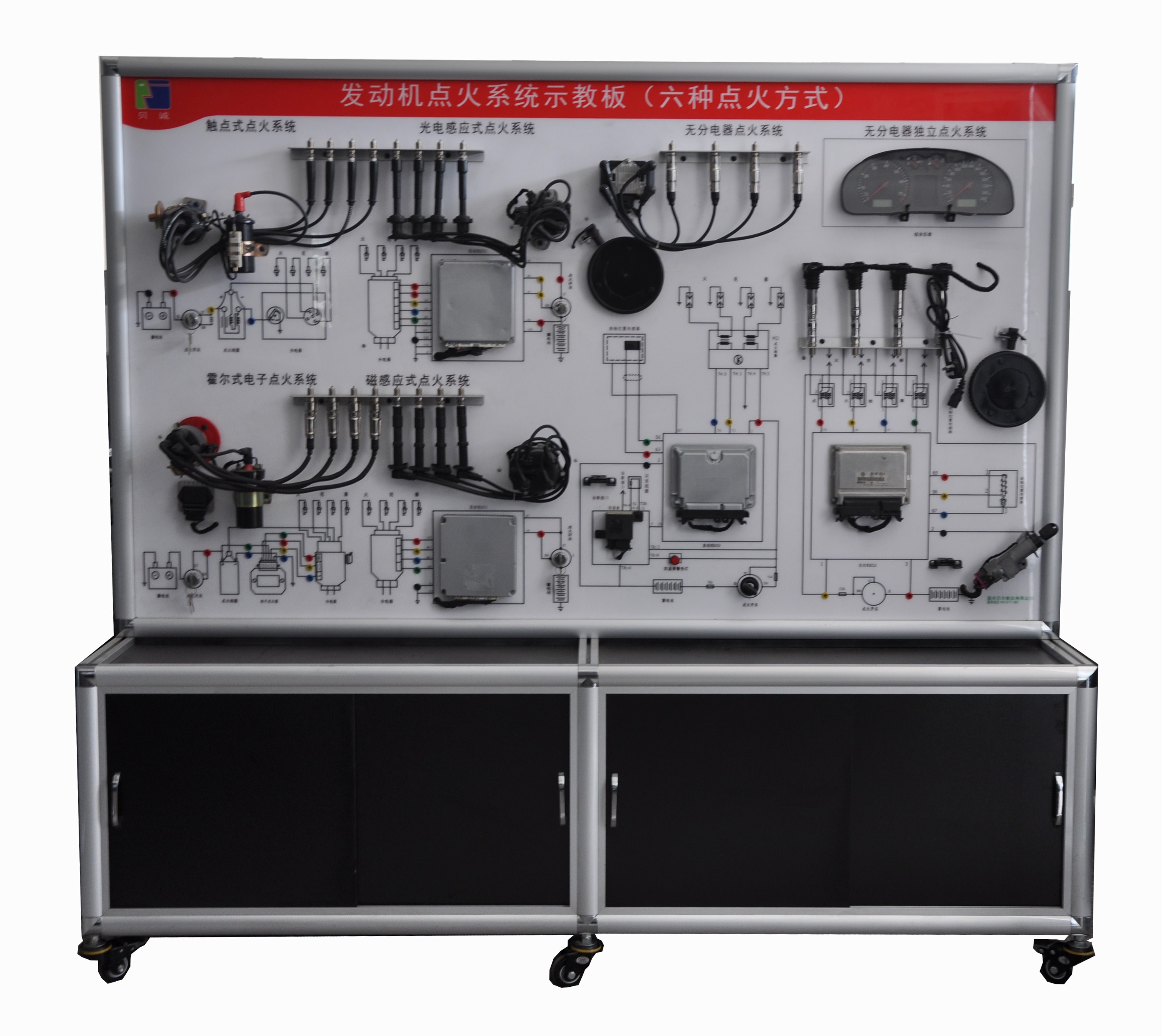 6、測量面板:面板上繪制了6種點(diǎn)火系統(tǒng)電路圖和4mm測量端子,通過萬用表或示波器在測量端子出檢測各電氣元件的電壓、電阻、頻率、波形;配備數(shù)字式點(diǎn)火頻率表、點(diǎn)火提前角表、三針放電裝置、點(diǎn)火閉合角表,能測量實(shí)時(shí)點(diǎn)火提前角