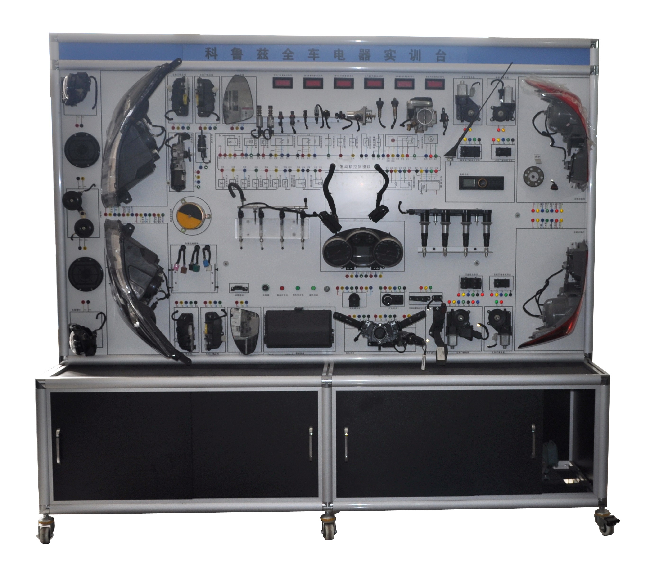 4. 實訓(xùn)臺面板上安裝有檢測端子,可直接在面板上檢測汽車車身電器系統(tǒng)各電路元件的電信號,如電阻、電壓、電流、頻率信號等。