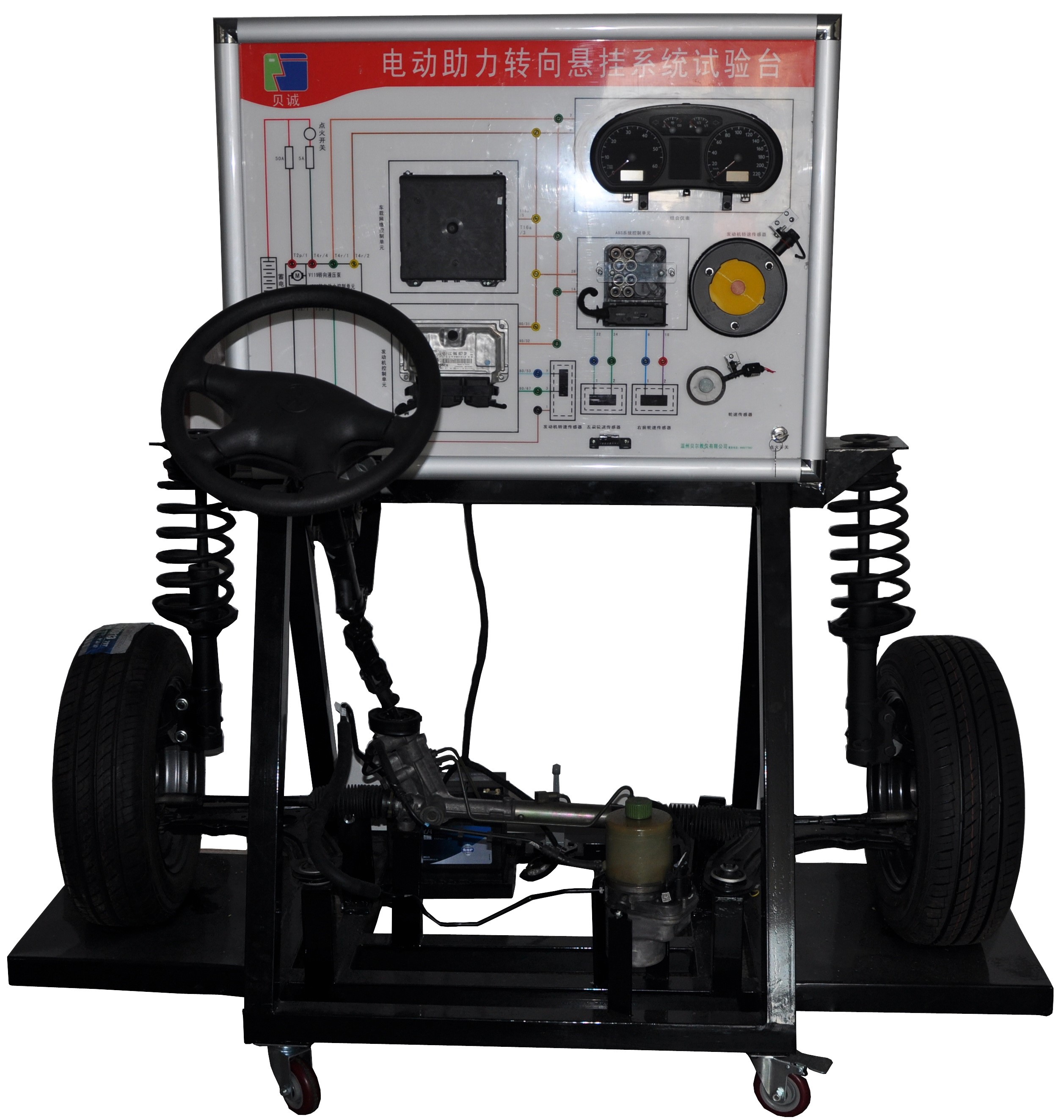 6、測量面板:面板上有電控助力轉(zhuǎn)向系統(tǒng)電路圖和4mm測量端子,同構(gòu)萬用表或示波器在測量端子處檢測各電器元件的電壓、電阻、頻率或波形