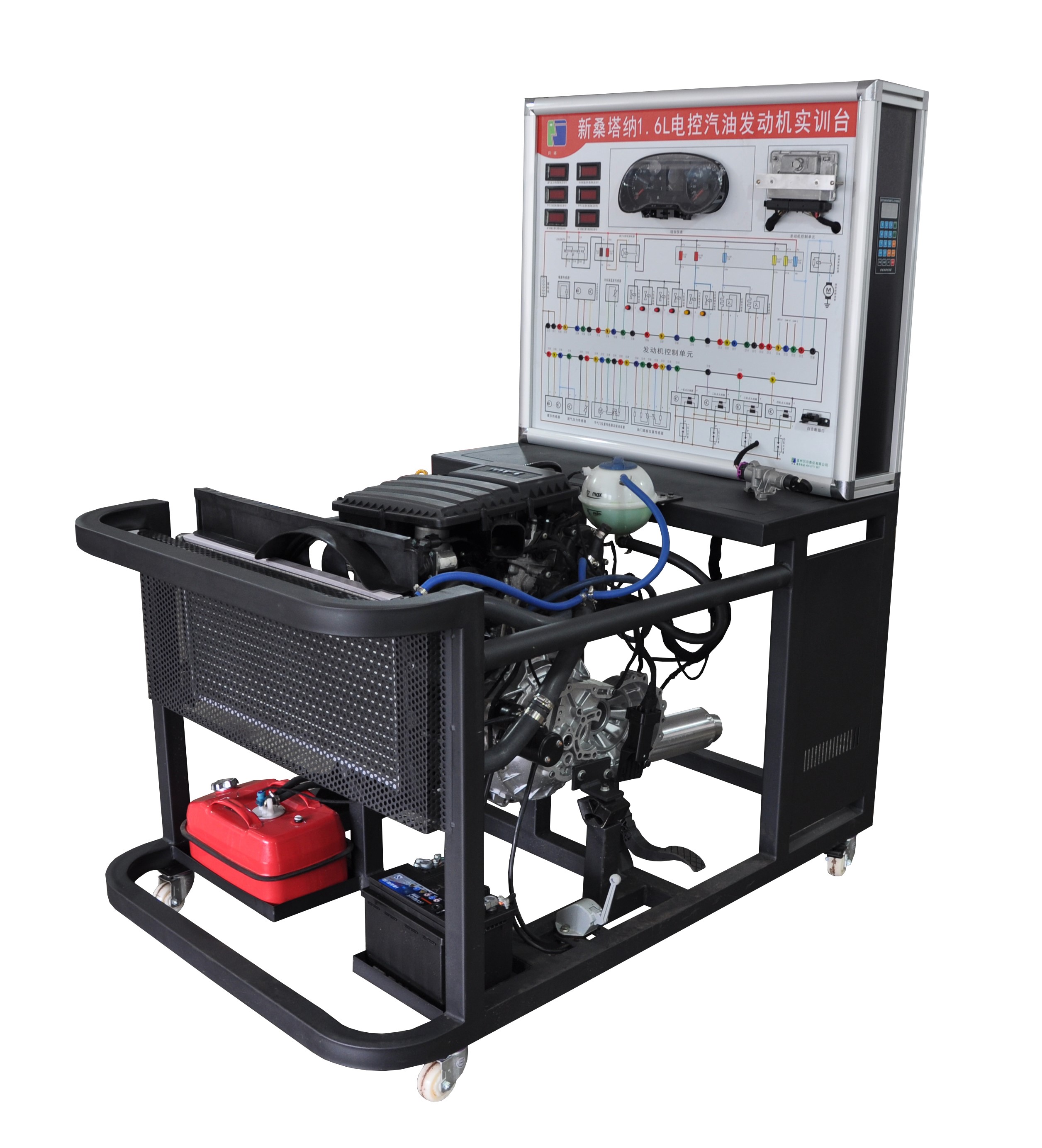2、操作控制臺:用于啟動和關(guān)閉發(fā)動機,油門踏板對發(fā)動機轉(zhuǎn)速進行調(diào)節(jié)。包括汽車儀表板總成、點火開關(guān)、實訓(xùn)臺電源總開關(guān)、油門踏板、燃油壓力表和真空表。